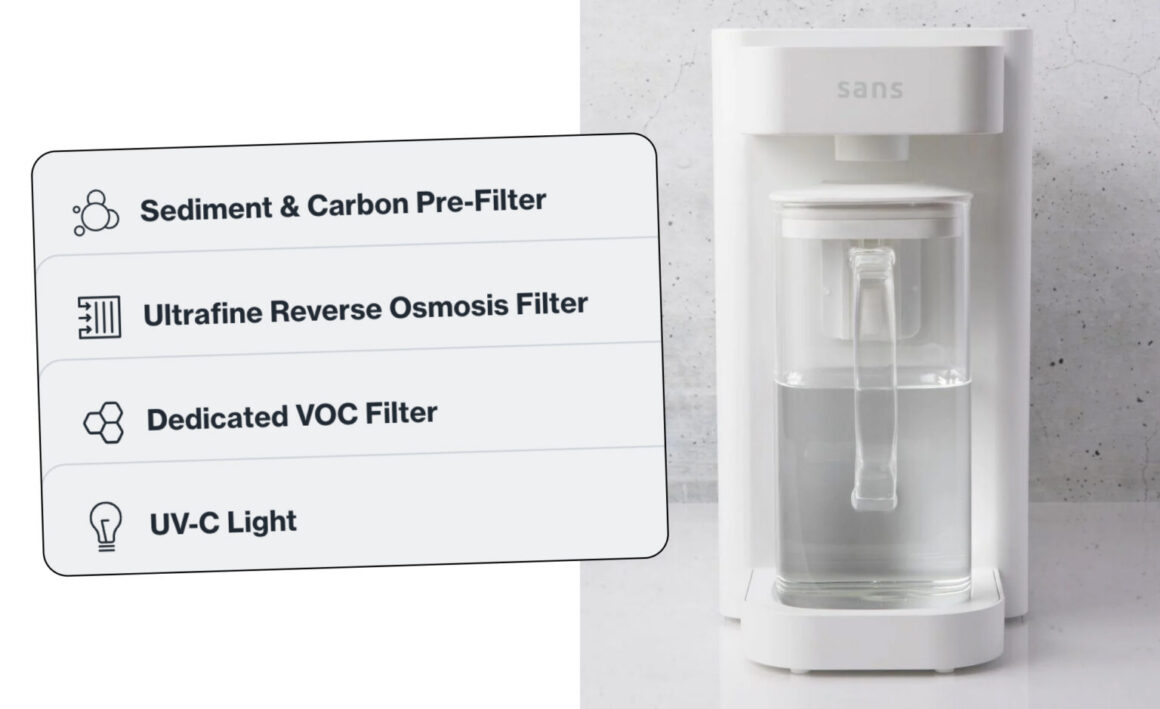 Why Sans Water Purifier is the best solution: Sans combines 5 layers of purification tech to eliminate the full range of contaminants. Sans uses a carbon filter to capture chemical byproducts and a VOC filter to trap volatile organic compounds and industrial chemicals… in addition to their gold standard reverse osmosis.